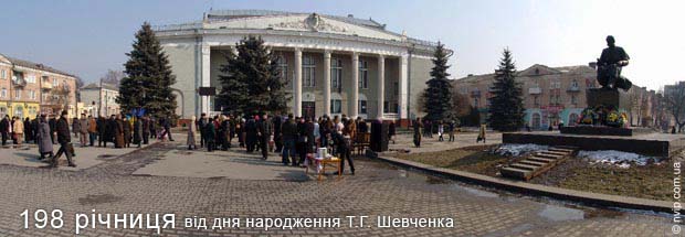 Сьогодні виповнюється 198 років від дня народження Великого Кобзаря. У місті пройшли урочисті події з цієї нагоди. Покладання квітів до пам’ятника Т.Г. Шевченка, промова міського голови В.Б. Сапожнікова, депутата верховної ради України — Віктора Степановича Олійника, керівника молодіжної громадської організації «Молодіжна ініціатива» — Олександра Топорівського.