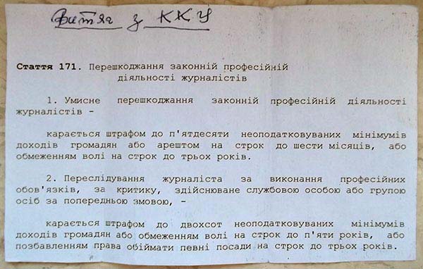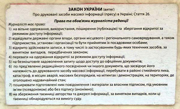Хлопці із НВІПу напишуть про це, без сумніву, рейдерське захоплення краще, аніж я. «Закон України про пресу» дозволяє багато чого для журналістів. Та, й покарання передбачене Кримінальним Кодексом України за перешкоджання журналістській діяльності, досить таки суворе. Я неодноразово зіштовхувався із нерозумінням обивателів і працівників правоохоронних органів, які не знають законодавства держави України і, як дуб-дерево, не бажають вивчати його. Так було, наприклад, у деяких багатьох кричущих випадках перешкоджання моїй журналістській роботі – у виборчій комісії нашого Нововолинська, біля нещодавно знесеного пам’ятника «вождю» світового пролетаріату на шахті № 9, школі № 2…