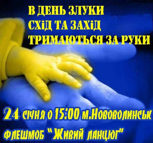 Нововолинський осередок “Патріот України” спільно з Нововолинським осередком Української Республіканської Партії, ВО Самопоміч, ВО Свобода,Партією Удар Віталія Кличка, Конгресом Українських Націоналістів та Самообороною міста Нововолинська у суботу 24 січня 2015 року о 15 :00 проведе патріотичний флешмоб в честь дня об’єднання ЗУНР і УНР в єдину державу.