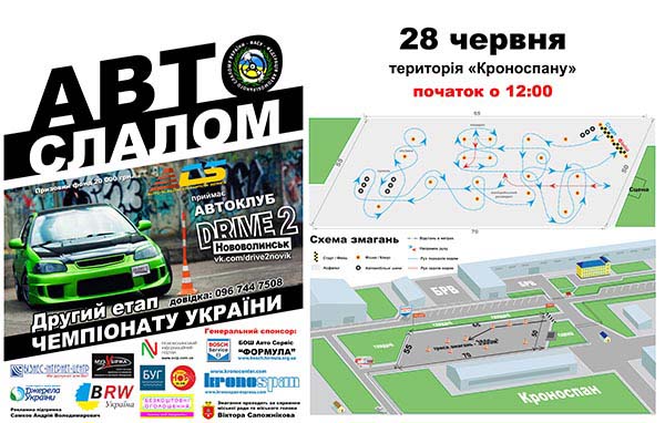 Нагадаємо, що 28 червня (неділя) в нашому місті відбудеться другий етап Чемпіонату України з автослалому. Початок о 12:00, місце проведення змагань – територія заводу «Кроноспан» (автостоянка). До Нововолинська з’їдуться любителі автоспорту зі всієї країни.
