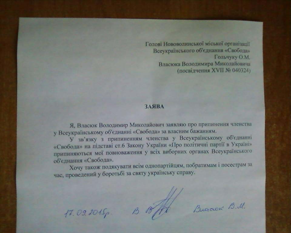 “Цей крок було зроблено свідомо і, я вважаю, чесно перед тими побратимами і посестрами, яких я поважаю і люблю навіть після виходу з партії. Бо там насправді дуже багато щирих і свідомих націоналістів, які готові рвати кадик любому за Ідею. Чого не скажеш про деяких ділків, яких з’їла мамона. Друзі цей крок мені дався з болем в душі, бо за стільки років ми з вами стали своєрідною сім’єю. Чинників мого виходу дуже багато, спостерігати за договорняками і тьорками мені набридло. Я поклав на кон дуже багато, та мої честь, чесність і щирість та тверда позиція перемогли кар’єру і підлабузництво. Лакеєм і шісткою у людей, які вскочили в дорогі костюми і всілися в дорогі іномарки та поклали болт на ідеали партії, а націоналізм відійшов в небуття, я не буду. Ще вчора ми стояли пліч-о-пліч на різних акціях, пікетах і вишколах, а сьогодні мамона декого з вчорашніх побратимів з’їла і похоронила, той стержень націоналізму. Тому хто вважає мій крок упередженим і збирається виливати на мене купу лайна, на тему продався, зрадив, заздрить і т. д., прошу тихенько самому видалитись з друзів. Також слід зазначити, залякувати і погрожувати мені наполегливо прошу, не варто. Хто мене знає особисто, він добре знає: це на Гоцула не діє!” – написав Володимир Власюк у соцмережі.