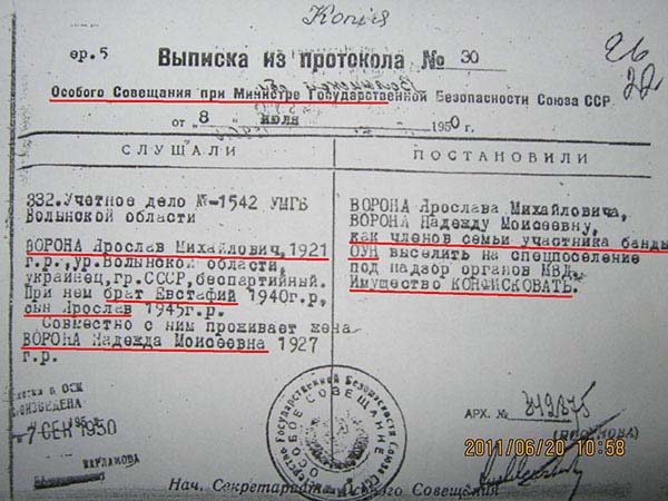 Наслідки комуністичної окупації ми пожинаємо і донині. Що стосується справи репресованого Ярослава Ворони, а також із деяких інших, відомих мені документів із КГБістських архівів, у тім числі й моєї родини, скажу: більшої жорстокості та цинізму, нахабства і підлості годі й віднайти. Висилати у райони крайньої Півночі Росії невинних людей тільки за те, що вони працювали на своїй землі, і у них не просихала сорочка від поту чи за щиру віру у Бога, конфіскувавши перед тим їхнє майно і землю, згодіться, можуть тільки психічно ненормальні люди чи садисти.