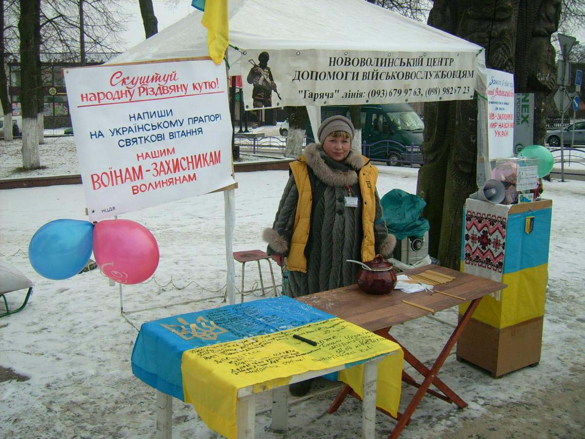 Волонтери Нововолинського центру допомоги військові працюють навіть на свята. На центральному ринку роздавали свічки з Вифлеємським вогнем, різдвяну кутю та збирали привітання для військових. Вдалося назбирати 1027 грн допомоги.