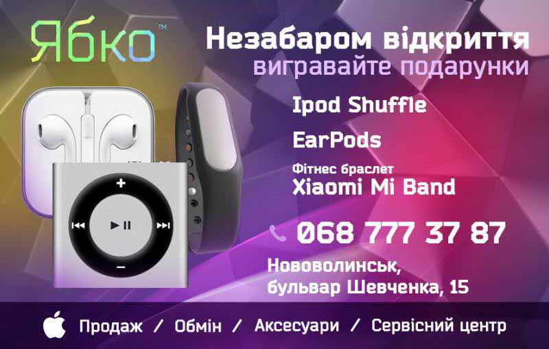 У березні 2016 року у нашому місті Нововолинську відбудеться відкриття магазину «Ябко». З цієї нагоди у соціальній мережі Вконтакті спільнота Ябко-Нововолинськ проводить конкурс, у якому розіграються цінні подарунки: Ipod Shuffle, навушники EarPods і фітнес браслет Xiaomi Mi Band. Як взяти участь в конкурсі дивіться тут.