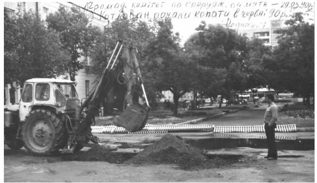 Нововолинцям варто пам’ятати, що коли у місті в 1989-1990 рр. почалися розмови про спорудження пам’ятника поету, на центральній площі міста у 1990 р. почали копати траншею під фундамент пам’ятника першобудівникам міста (фотографія прикладається). Задум був єзуїтським – на одній площі не може бути два пам’ятники, завдяки першорухівцям задум було зірвано. Уже після спорудження пам’ятника поету антиукраїнські сили закопували кістки кругом пам’ятника, щоб собаки мали роботу.