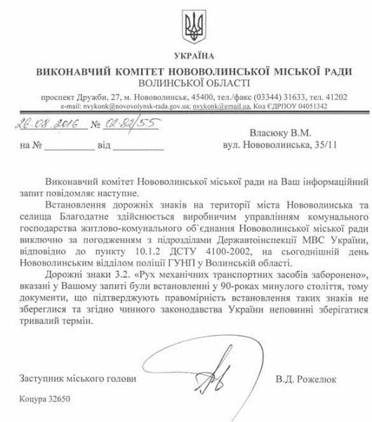 «Дорожні знаки 3.2 «Рух механічних транспортних засобів заборонено» встановлені у 90-х роках минулого століття, тому документи, що підтверджують правомірність встановлення таких знаків не збереглися та згідно чинного законодавства України не повинні зберігатися тривалий термін», – зазначають у відповіді за підписом першого заступника міського голови Володимира Рожелюка.