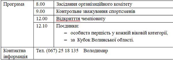 9 жовтня, о 12:00, у міському Палаці спорту відбудуться змагання з тхеквондо-ВТФ серед дітей, молодших юнаків, юнаків, кадетів та юніорів. Змагатись будуть спортсмени із клубів «ДІНАМІС» (м.Нововолинськ) та «Білий лев» (м.Луцьк).