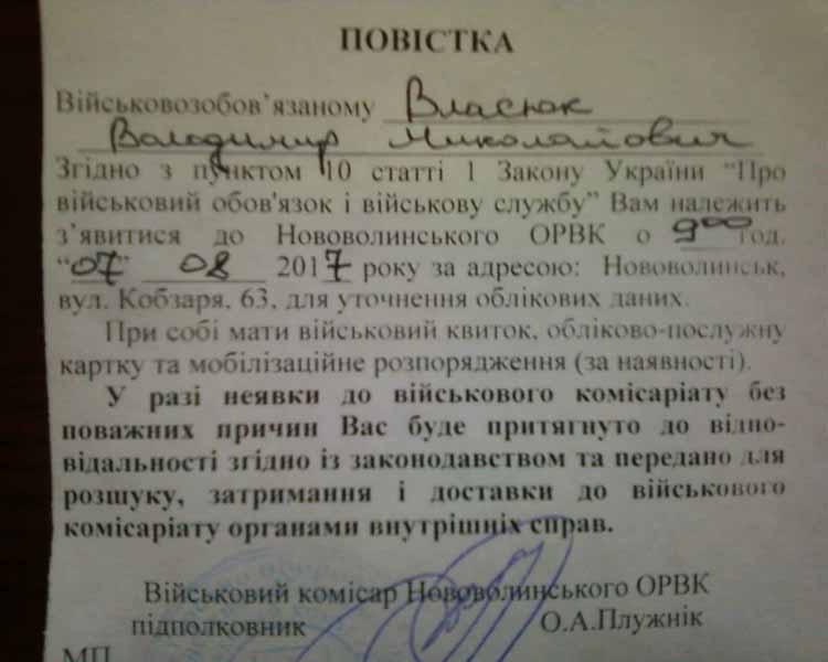 Я не хочу, вірити те, що мене замовили, а військкомат використовують як репресивну машину, щоб закрити рота за мою активну позицію, як громадського, політичного діяча так і голови профспілки «Захист праці», яка активно бореться проти закриття та розкрадання Шахти №1 «Нововолинська»! Я не хочу вірити в те, що влада таким чином хоче тиснути на мене. Людину, яка боролася з однією тиранією на Майдані, а потрапляє під каток і репресії іншої? Тому наразі вибачайте, йду підстригатися і збирати речовий мішок. Слава Україні!