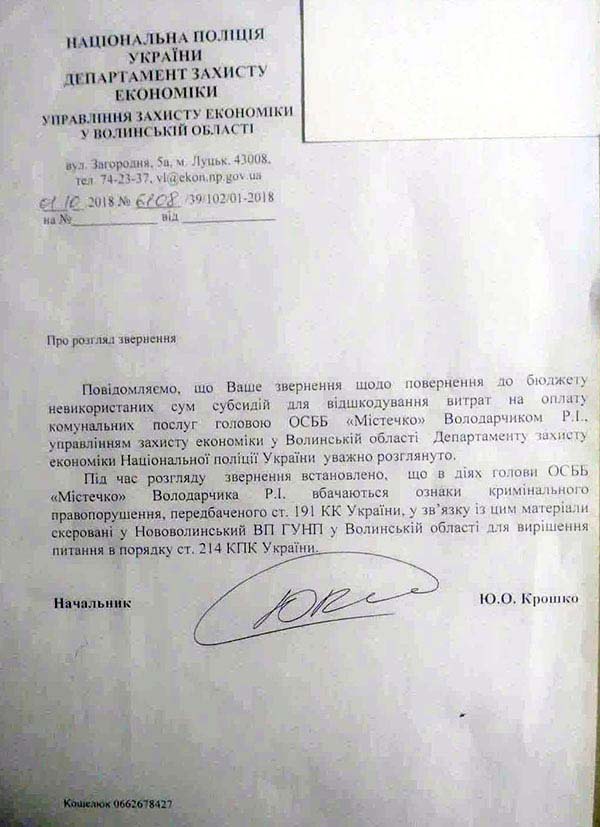 У відповіді начальник управління Юрій Крошко зазначив, що у діях голови ОСББ «Містечко» вбачаються ознаки кримінального правопорушення передбаченого статтею 191 ККУ і матеріали направленні до Нововолинського відділку поліції.