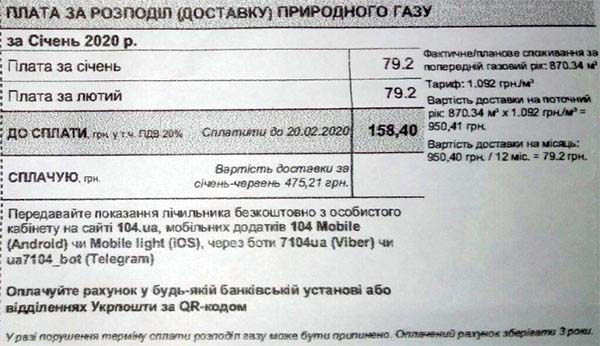 В рахунках до сплати сума за два місяці (січень + лютий). Плату за місяць вираховують за наступною формулою: фактичне споживання кубів за минулий газовий рік, яке множиться на тариф доставки газу і ділиться на 12 місяців.
