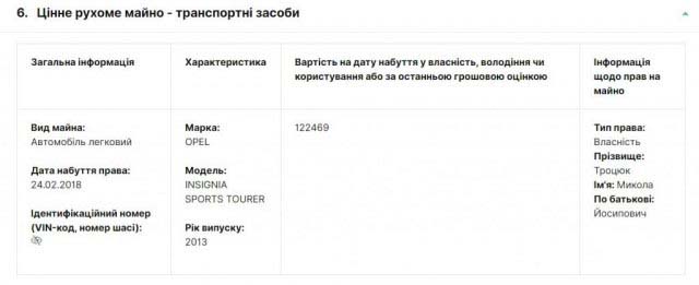 Авто Opel Insignia, на якому його зупинили, зазначається у щорічний декларації посадовця.