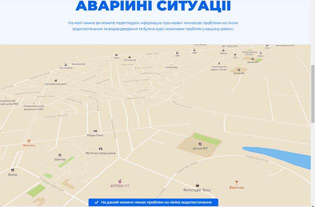 На сайті підприємства є мапа на якій можна онлайн моніторити аварійні ситуації, наявні тимчасові проблеми на лініях водопостачання та водовідведення та бути в курсі можливих проблем у вашому районі, але як це працює поки невідомо. На даний час споживачів запевняють, що проблем на лініях водопостачання немає. Тоді, що за субстанція тече із кранів по вулиці Нововолинській?