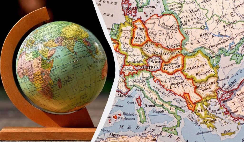 Політична карта світу в країнах ЄвропиКарта світу на пострадянському просторі, а саме в Україні, Росії, Білорусі та інших країнах, які раніше були у складі СРСР, має інший вигляд. Африка і Євразія розташовані в центрі, вертикаль проходить через Москву, Північна і Південна Америка – зліва, Аляска і Канада – праворуч угорі, а Австралія і Антарктида – внизу.