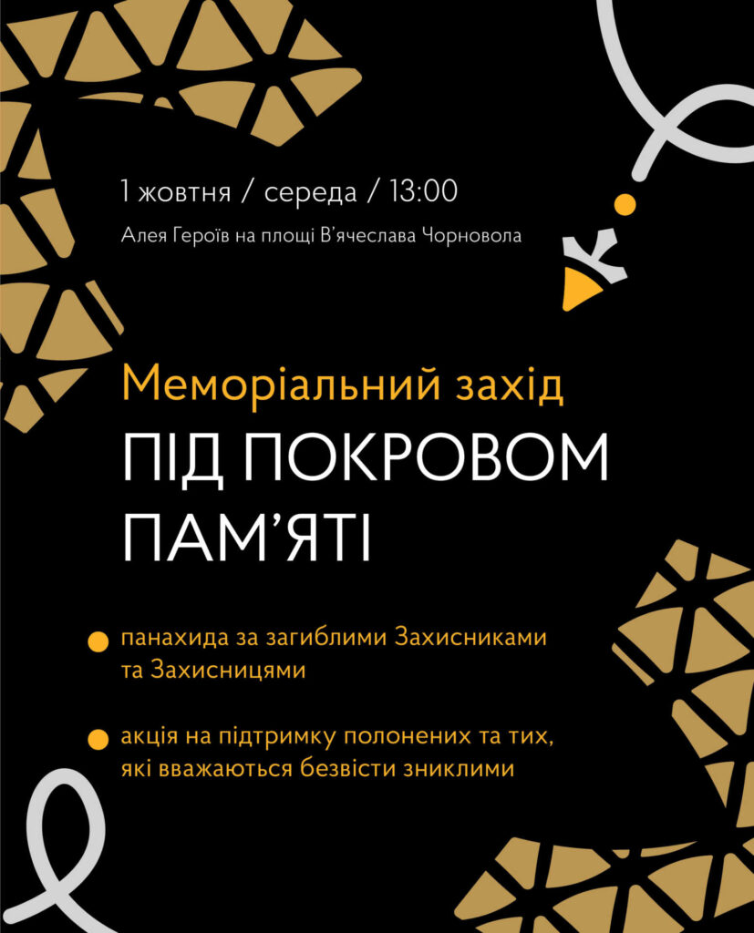 1 жовтня, в середу, о 13:00 біля Алеї Героїв (на площі Чорновола) розпочнеться меморіальний захід «Під покровом пам’яті» та панахида за полеглими Захисниками та Захисницями.