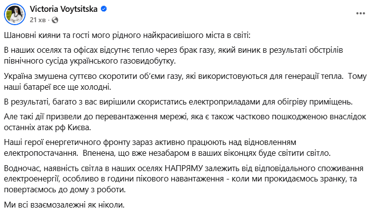Вона пояснила, що в Києві, як і в багатьох містах України, досі не дали тепло в батареї через брак газу, який виник внаслідок обстрілів Росією українського газовидобутку.