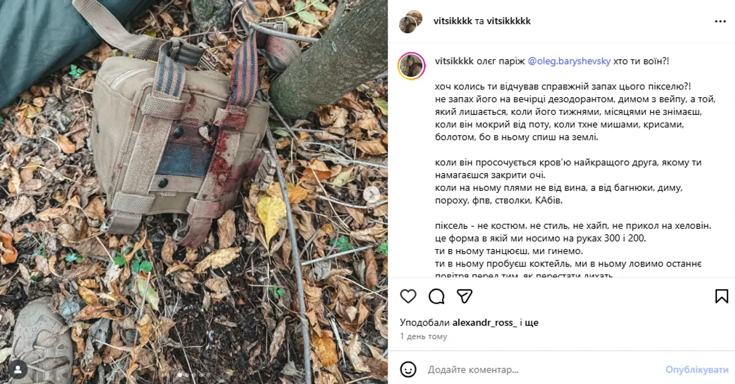 «Піксель — не костюм, не стиль, не хайп, не прикол на Гелловін. Це форма, в якій ми носимо на руках 300 і 200 (поранених і загиблих — ред.). Ти в ньому танцюєш, ми гинемо. Ти в ньому пробуєш коктейль, ми в ньому ловимо останнє повітря перед тим, як перестати дихать», — зазначив військовий.
