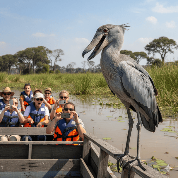 Група туристів в Уганді отримала незабутні враження, коли один із найбільших і найдивовижніших птахів на планеті — рідкісний кітоглав (shoebill) — сів прямо на їхній човен. Ця сцена, схожа на кадри з «Парку Юрського періоду», відбулася в популярному місці для спостереження за птахами — затоці Мабамба на озері Вікторія. Величезна істота, часто описувана як релікт епохи динозаврів, стояла лише за кілька сантиметрів від ошелешених відвідувачів.