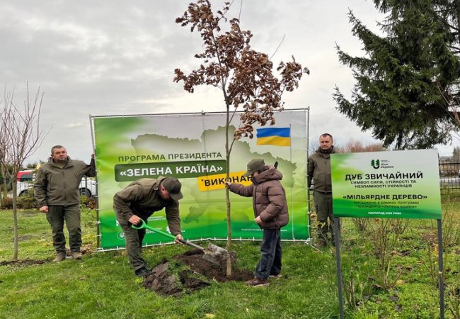 Символічним мільярдним деревам став дуб звичайний. Його посадив ветеран війни, лісівник Андрій Яцина. Від початку повномасштабного вторгнення чоловік служив у 14-й окремій механізованій бригаді, а після демобілізації у 2025 році повернувся на колишню роботу.