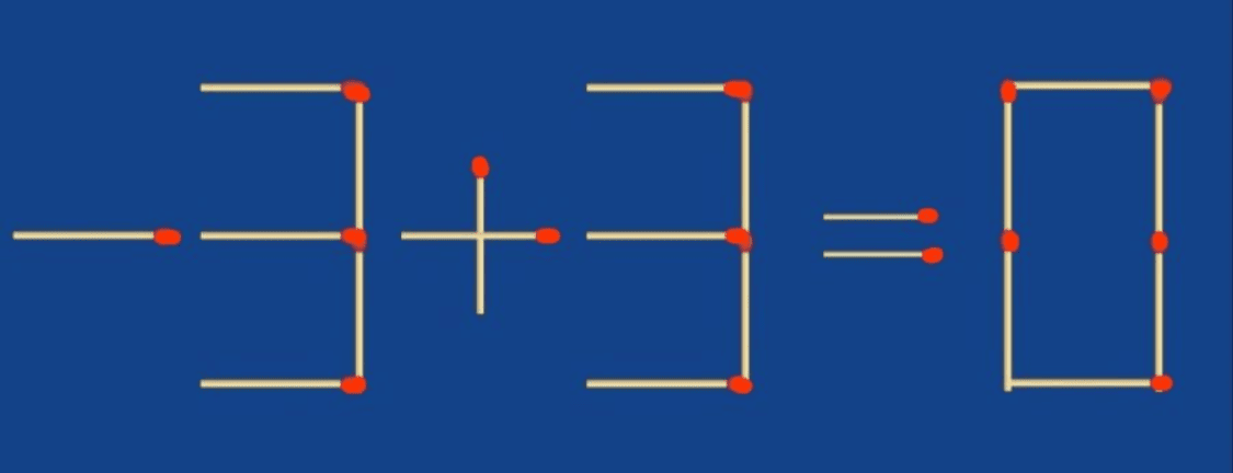 А тепер — найефектніший третій варіант, який дивує навіть досвідчених фанатів головоломок зі сірниками. Забираємо ліву вертикальну сірнику з «8» — і цифра перетворюється на «0». А залишену сірнику кладемо перед першою трійкою, утворюючи мінус. Маємо витончене рішення: –3 + 3 = 0. Лаконічно, логічно й трішки зухвало — якраз те, що робить головоломку по-справжньому цікавою.