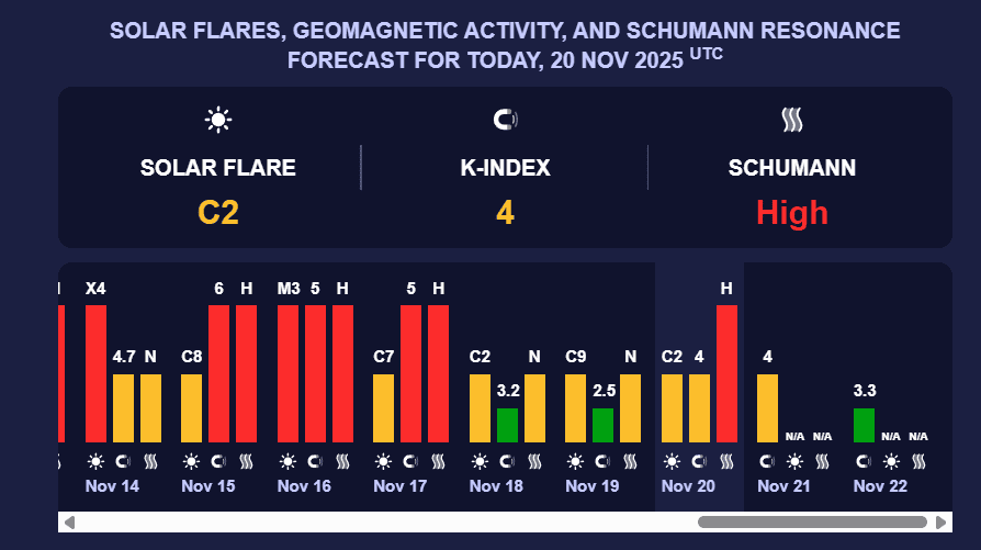 Сьогодні, 21 листопада, очікується магнітна буря середньої потужності. Вона відповідатиме К-індексу 4 (жовтий рівень).