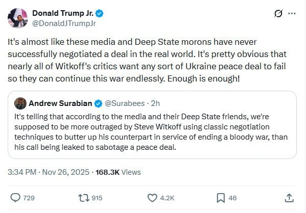«Складається враження, що ці медійні та „глибокі державні“ ідіоти ніколи успішно не домовлялися про угоду в реальному світі. Цілком очевидно, що майже всі критики Віткоффа хочуть, щоб будь-яка мирна угода з Україною провалилася, аби вони могли продовжувати цю війну нескінченно. Досить — це вже досить!», — написав він.