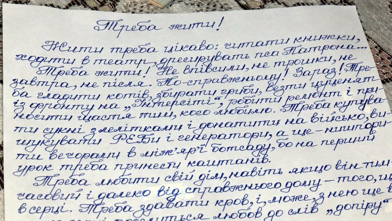 «В нас тато був в армії писарем, і так любив нас каліграфії вчити, прописи давав. Зараз таких нема, посадить і кожну буквочку щоб виводили. Добре тако знати українську, розмовляти і грамотно писати», – говорить жінка.