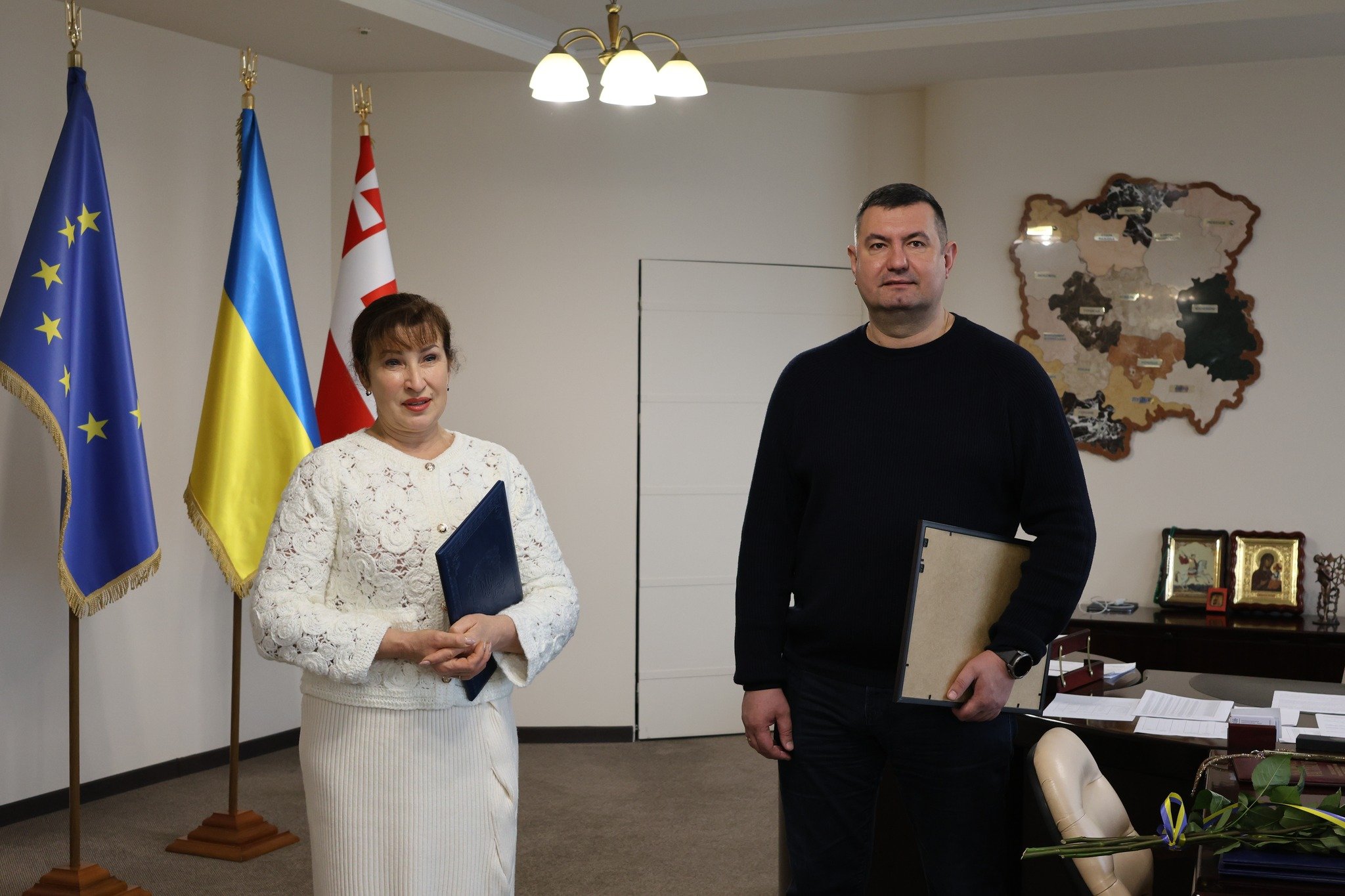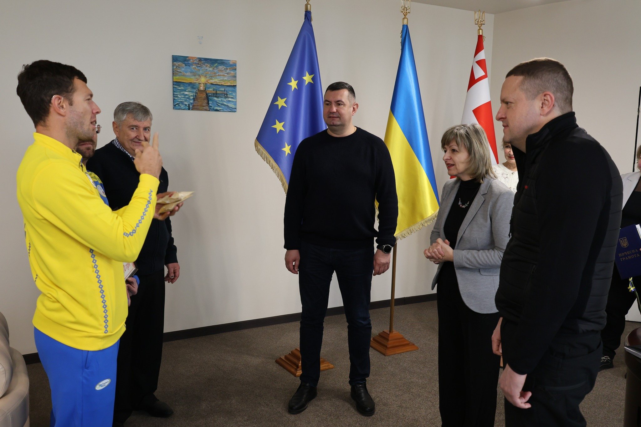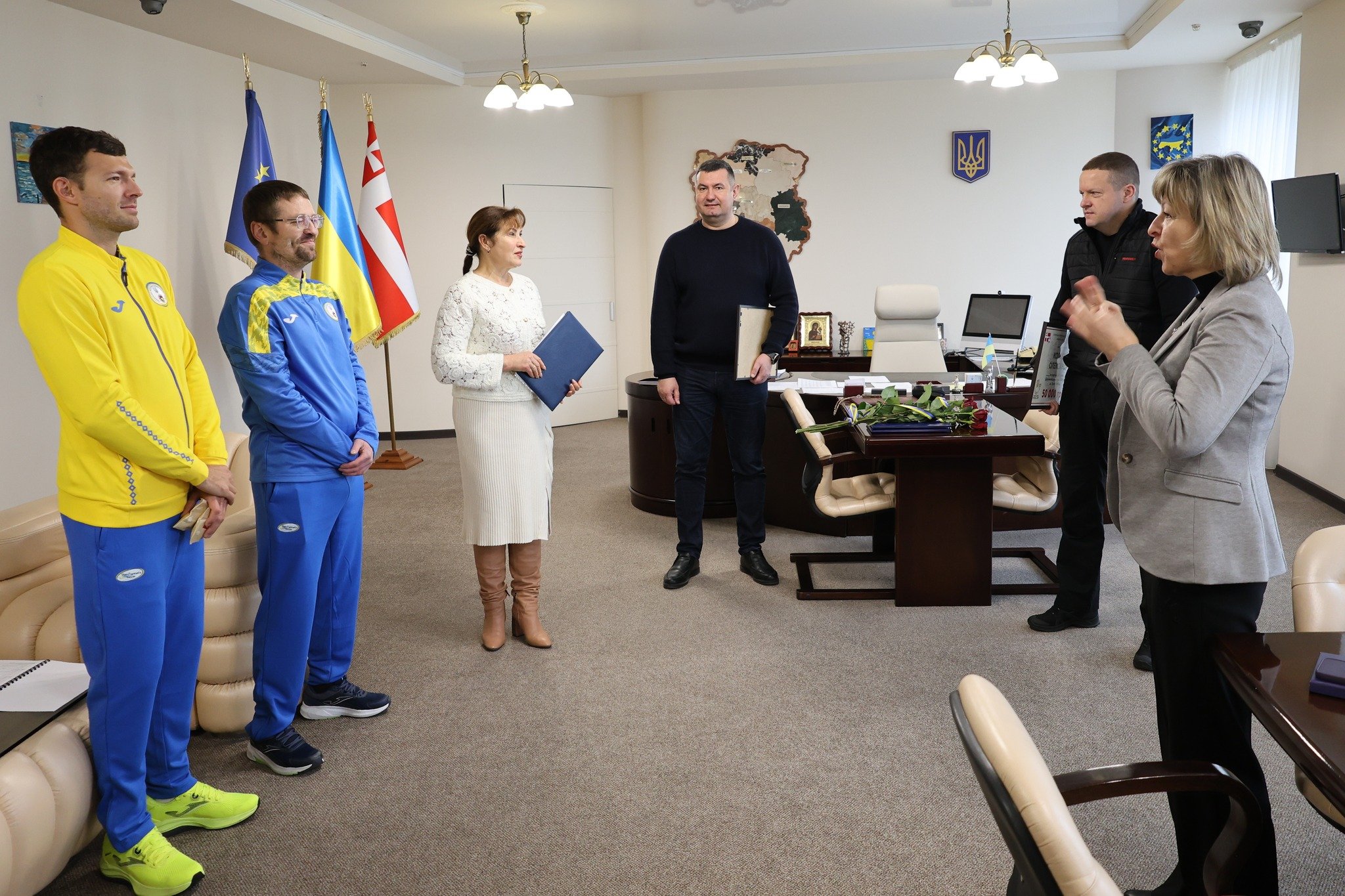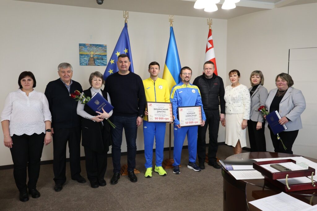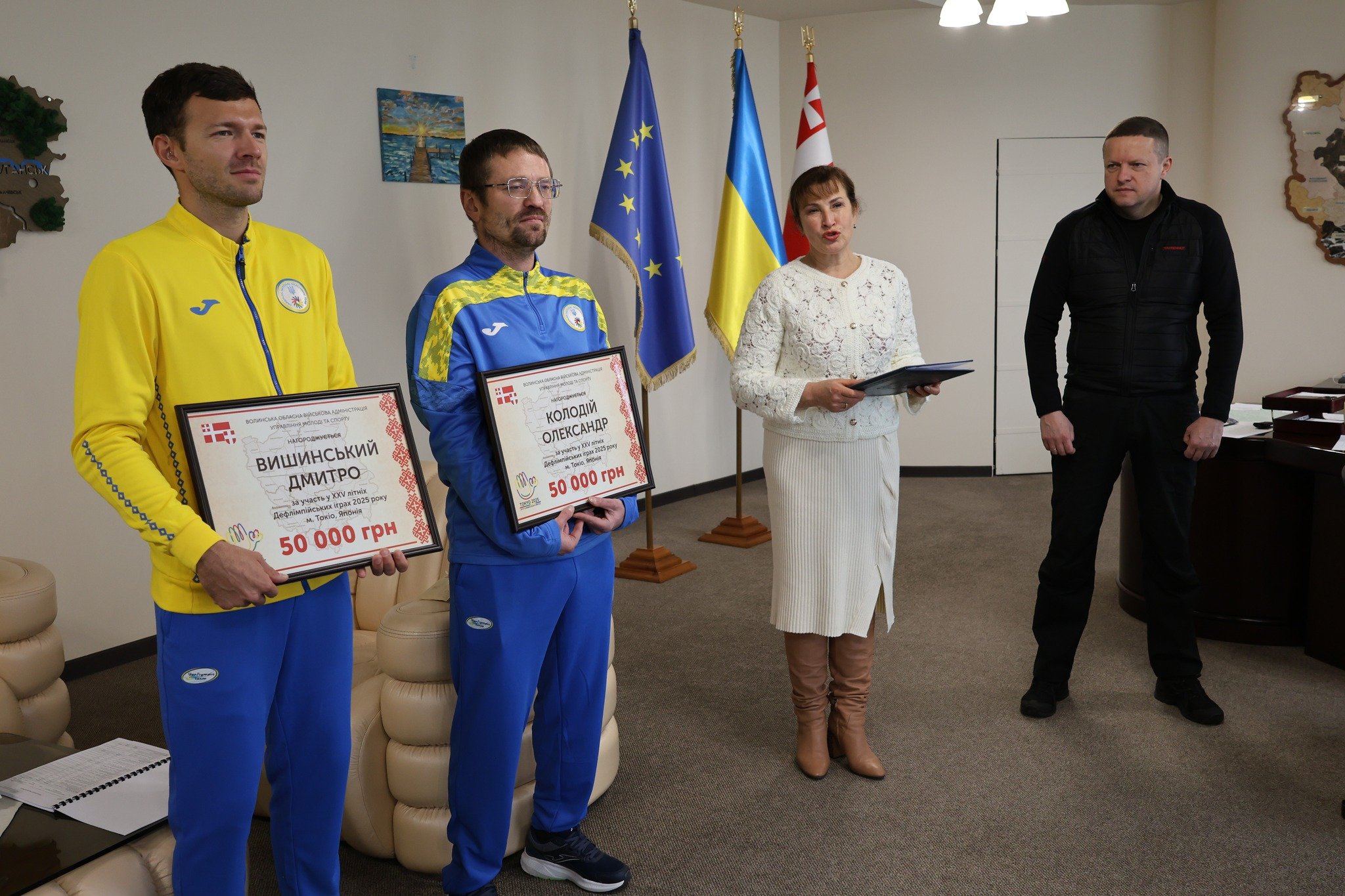 Очільник Волині разом із головою обласної ради Григорієм Недопадом вручили Дмитру та Олександру грошові сертифікати по 50 тисяч гривень, а тренерів і партнерів відзначили почесними грамотами. Окремим символічним моментом стало вручення керівникам області талісманів із Токіо – подарунків від спортсменів на знак вдячності за підтримку.