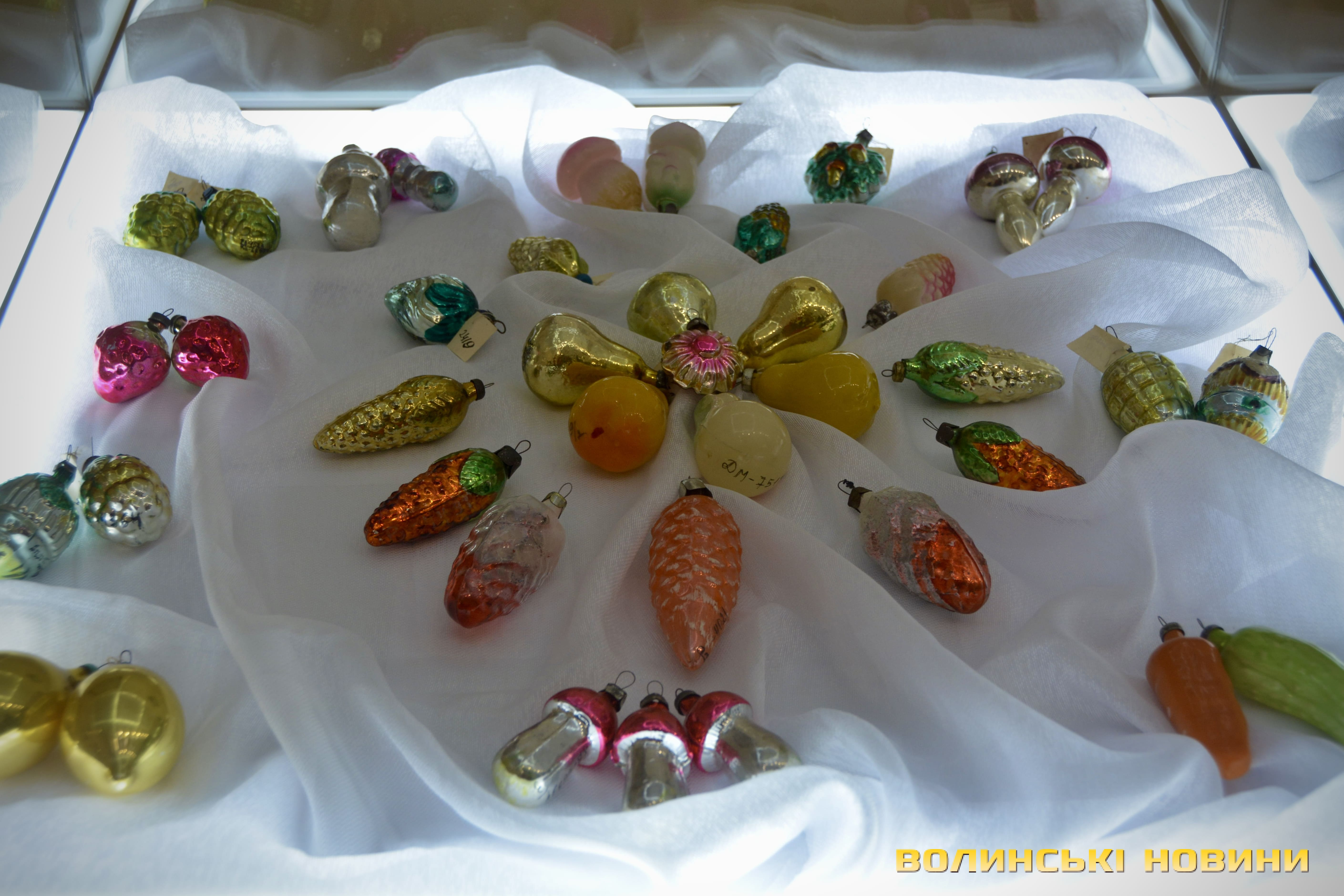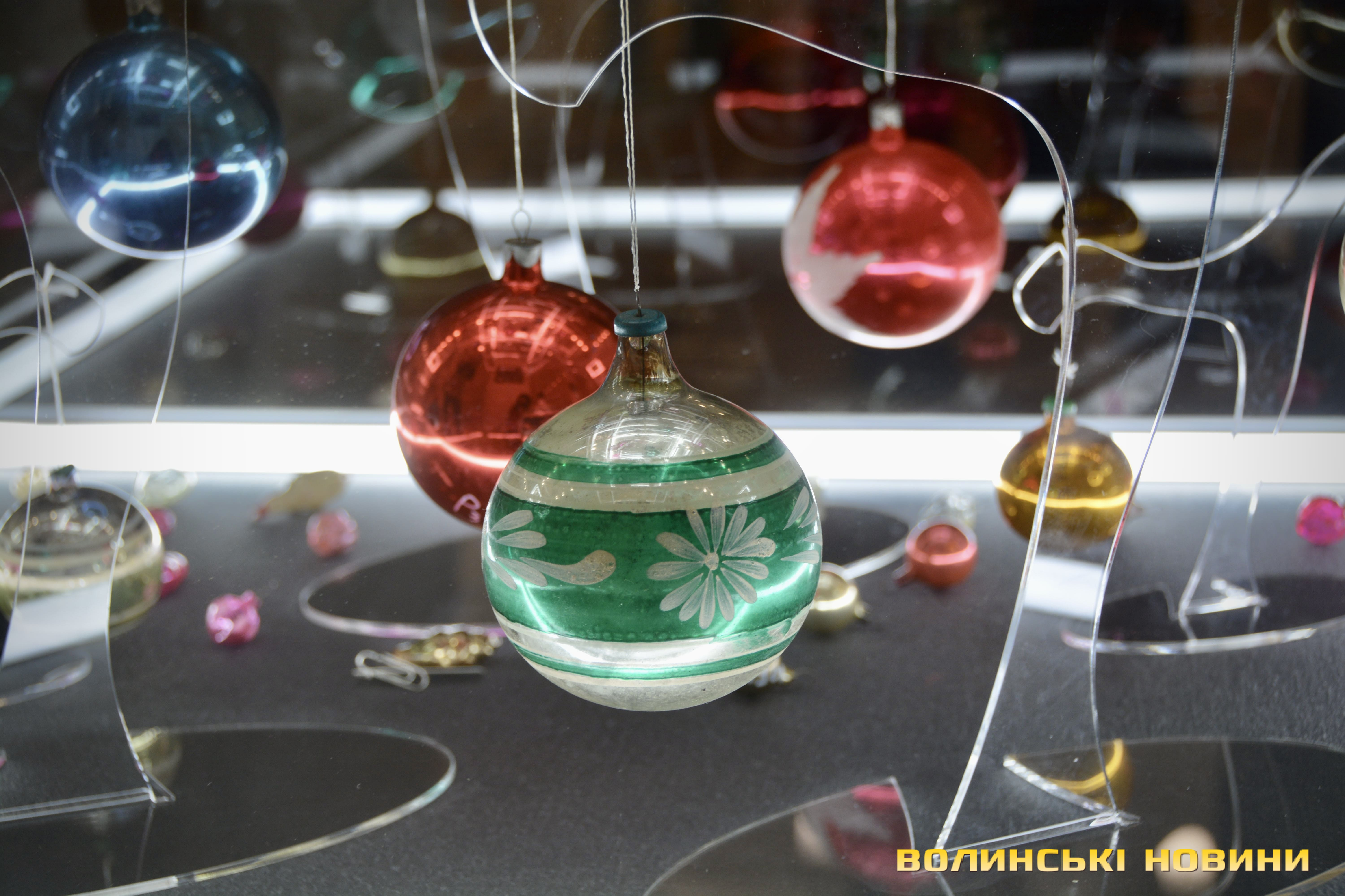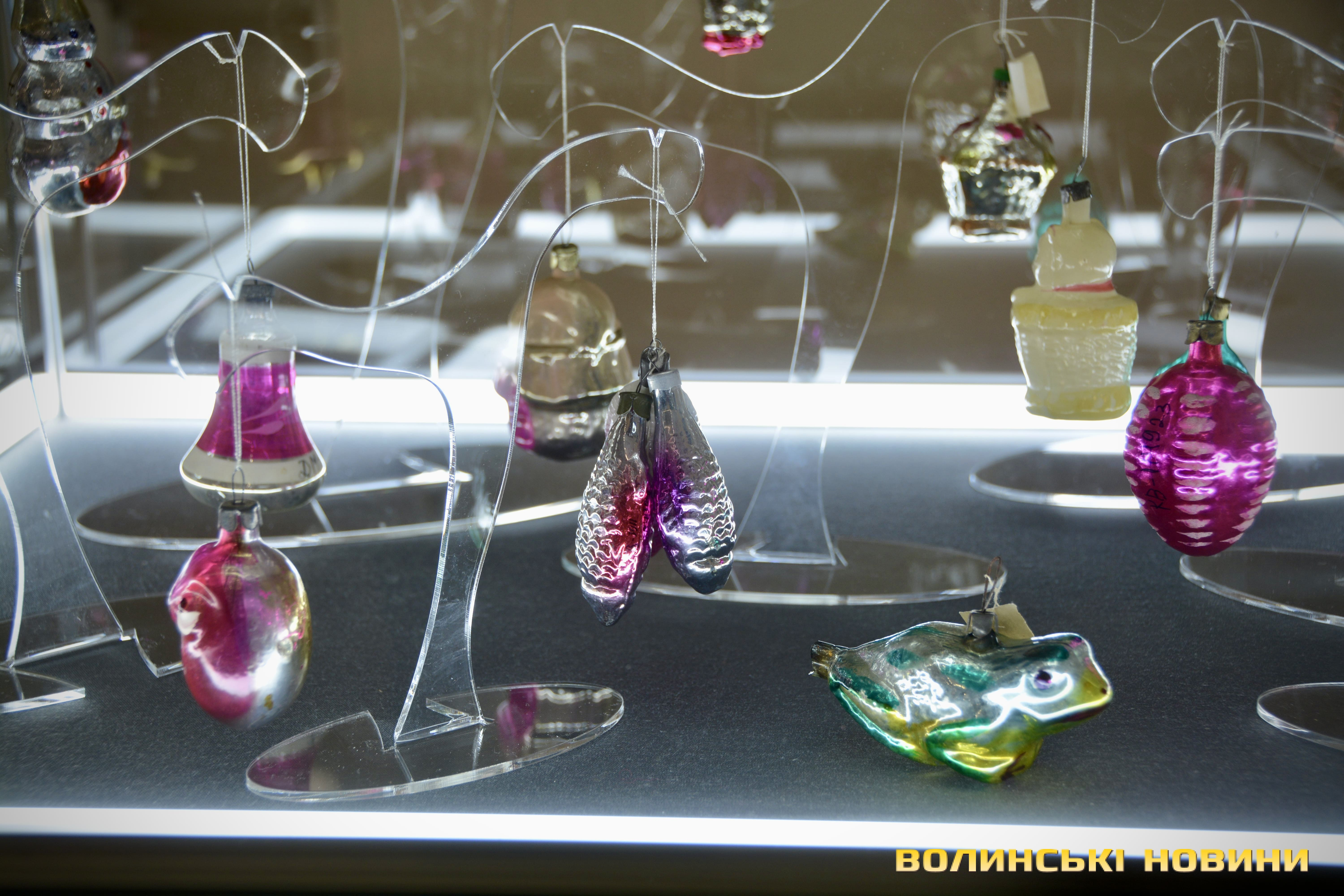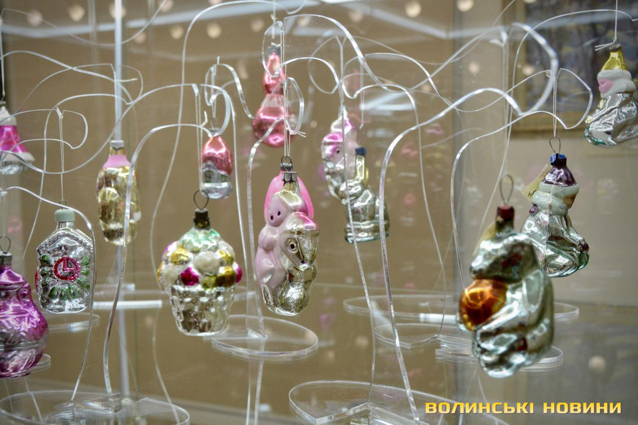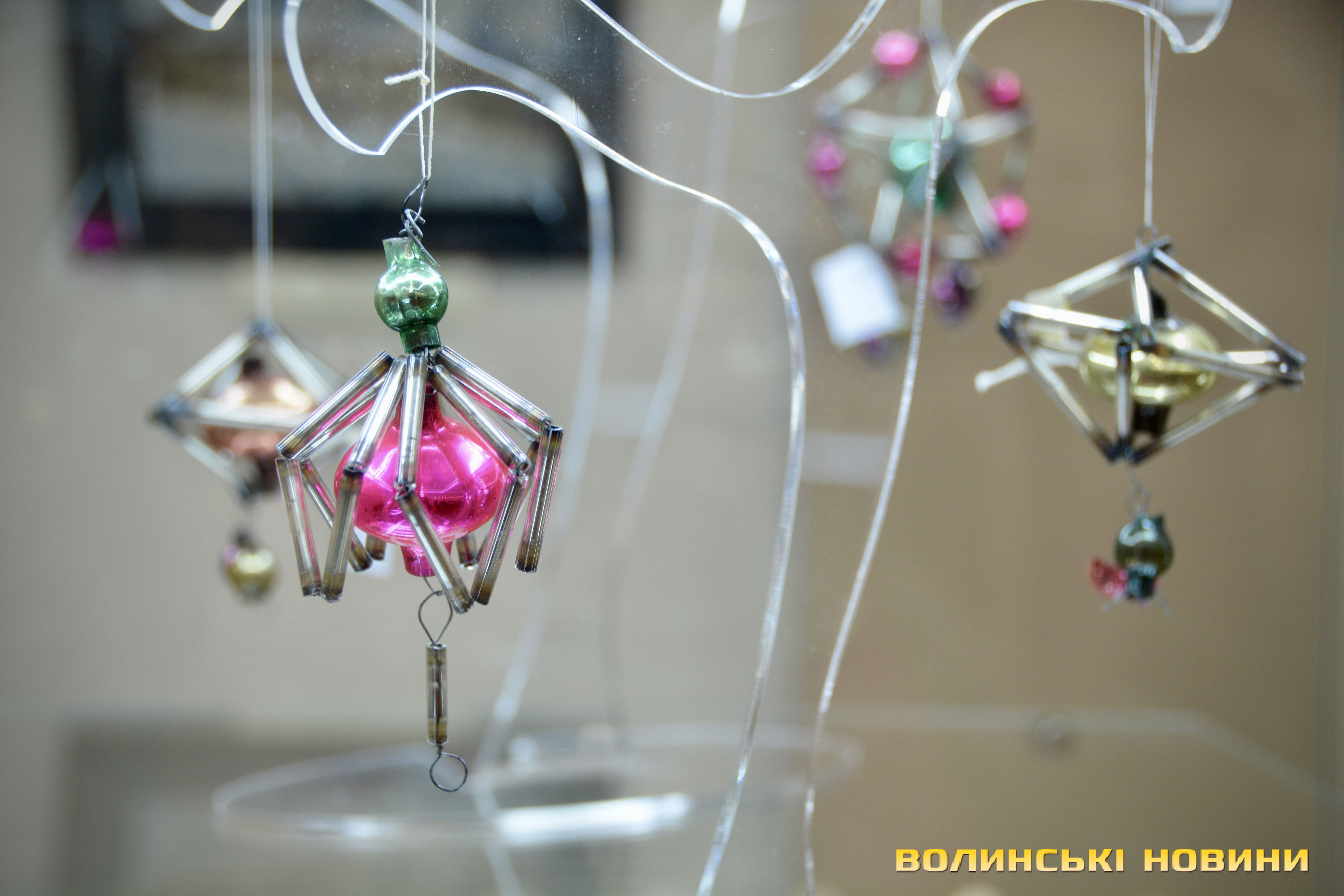 Серед представлених ялинкових прикрас – іграшки зі стеклярусу, виготовлені на заводі в Луцьку в 1950-х роках. Відома навіть їх авторка – це лучанка Ганна Домбровська, яка працювала на заводі й у 1958 році передала іграшки музею. Саме ці роботи стали основою музейної колекції ялинкових іграшок, формування якої триває до сьогодні.