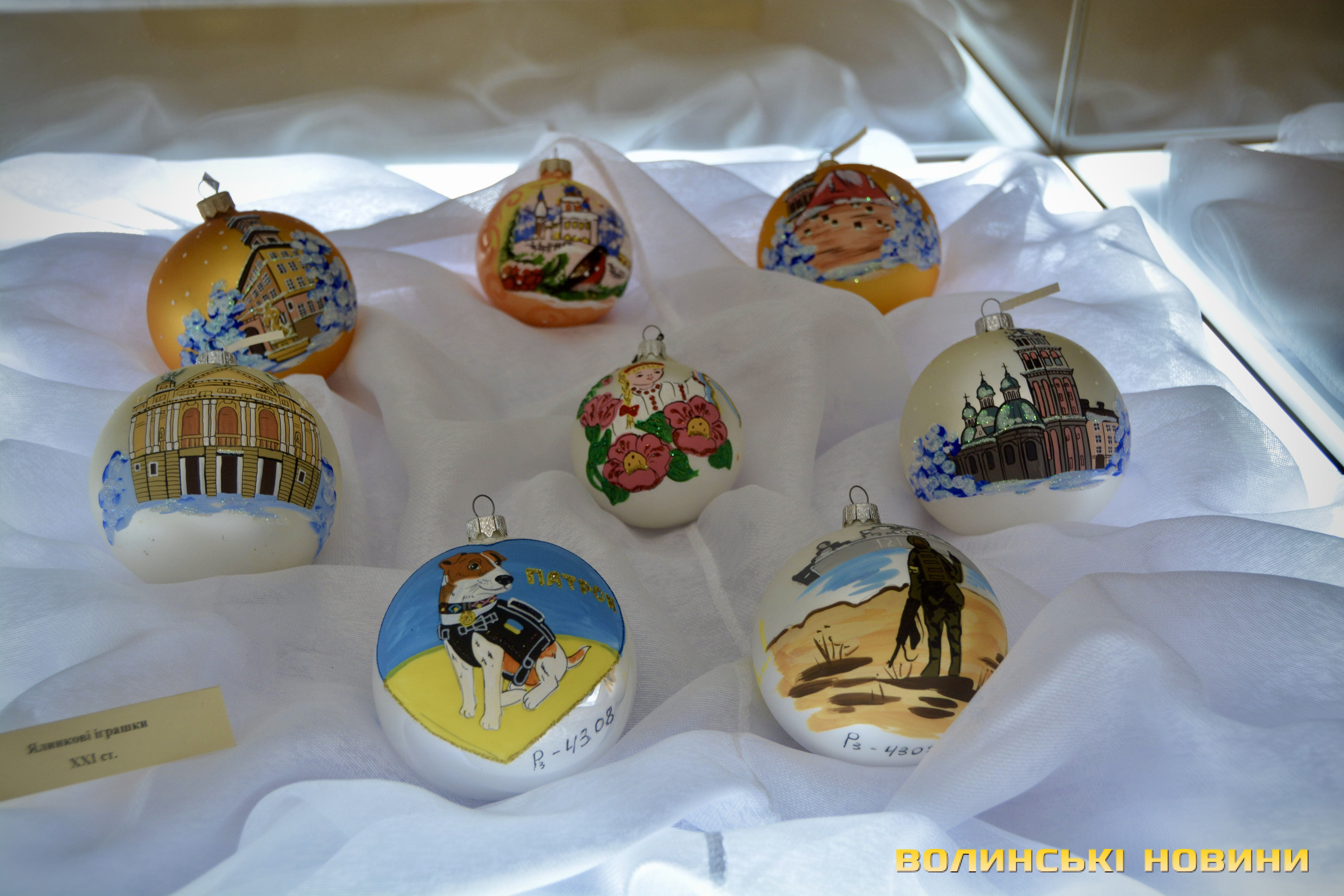 Своєю чергою, сучасні ялинкові кульки з різноманітними сюжетами щороку дарує краєзнавчому музею колектив Музею волинської ікони. Серед них – іграшки з зображеннями пса Патрона, російським воєнним кораблем, який іде у відомому напрямку, ангелом у молитві, народженням Ісуса, архітектурними об’єктами Львова.