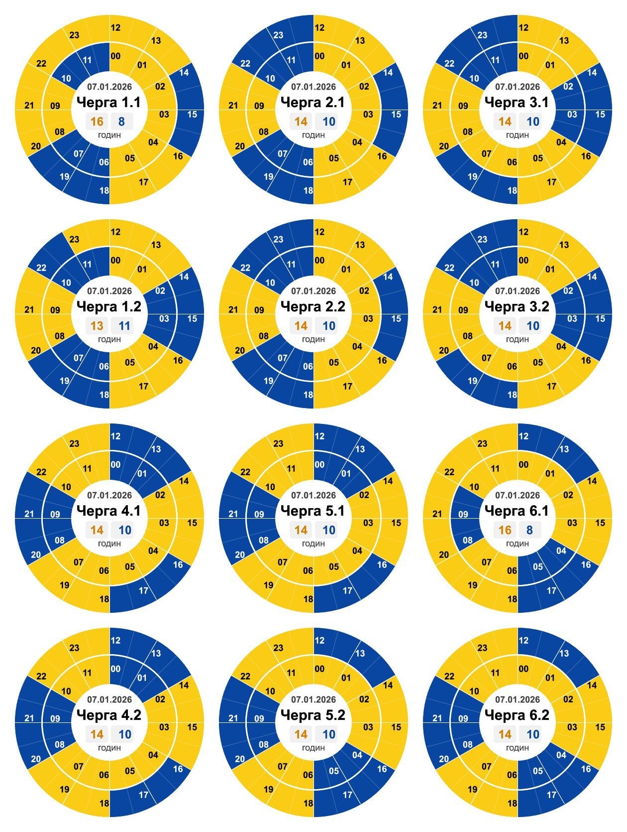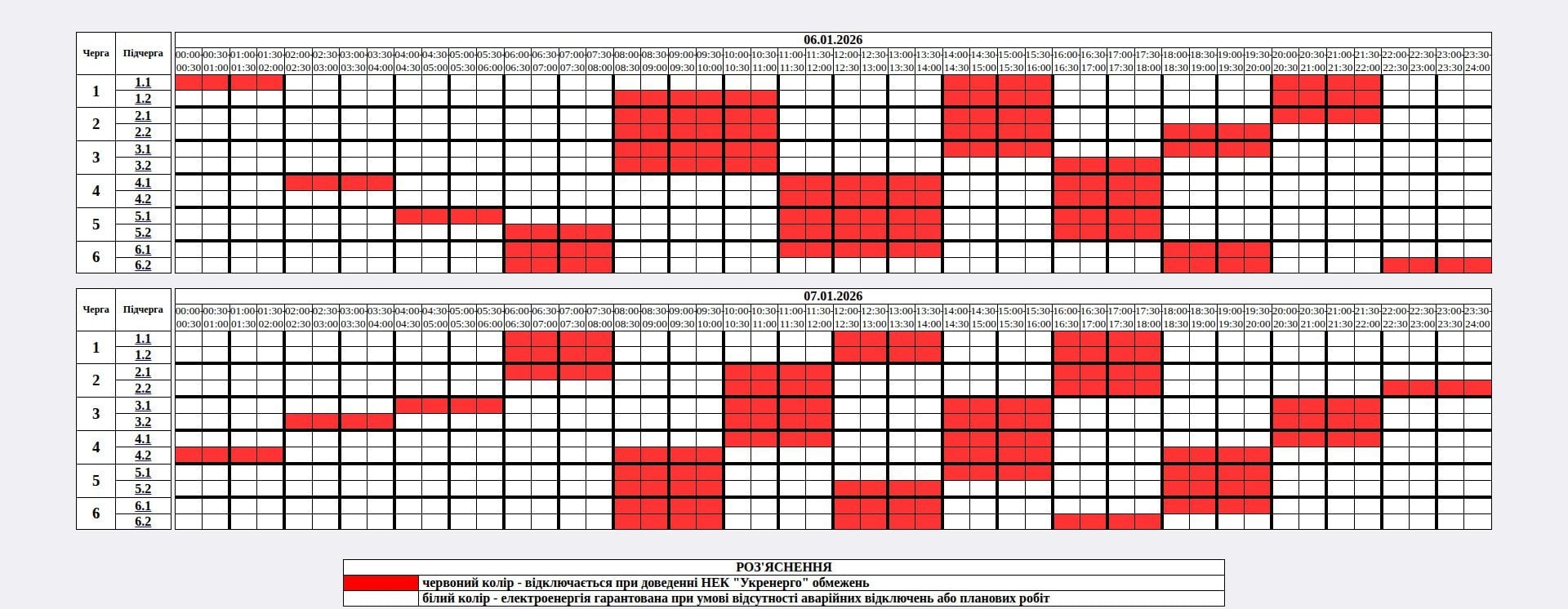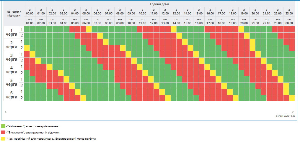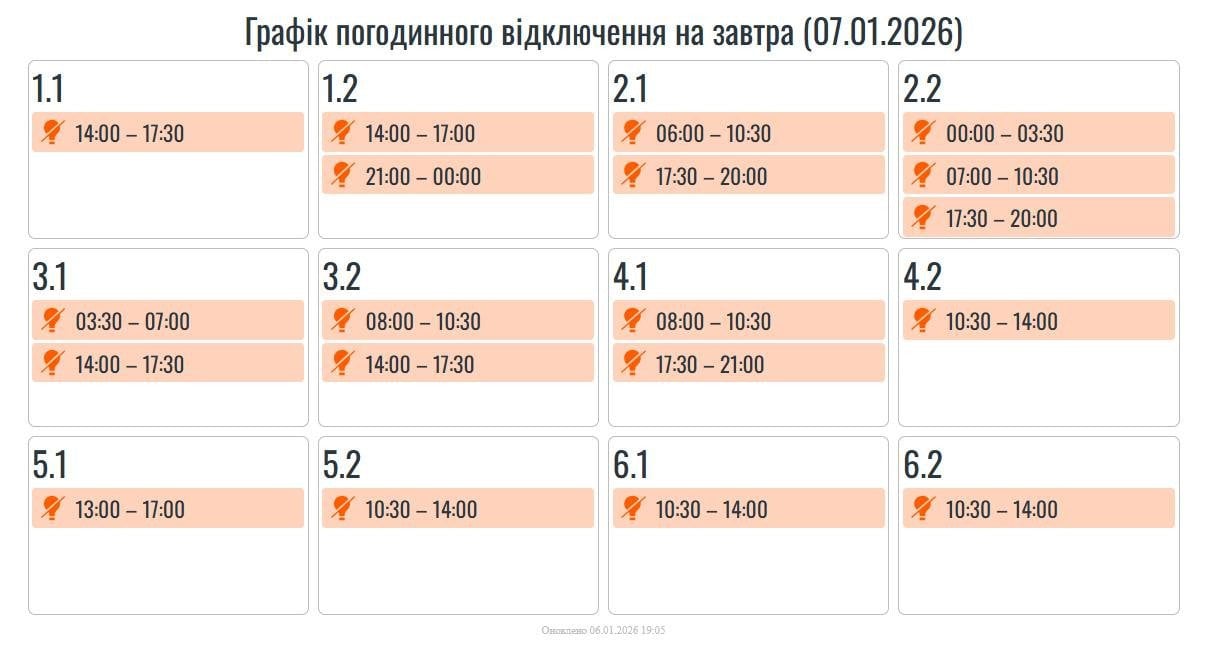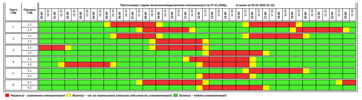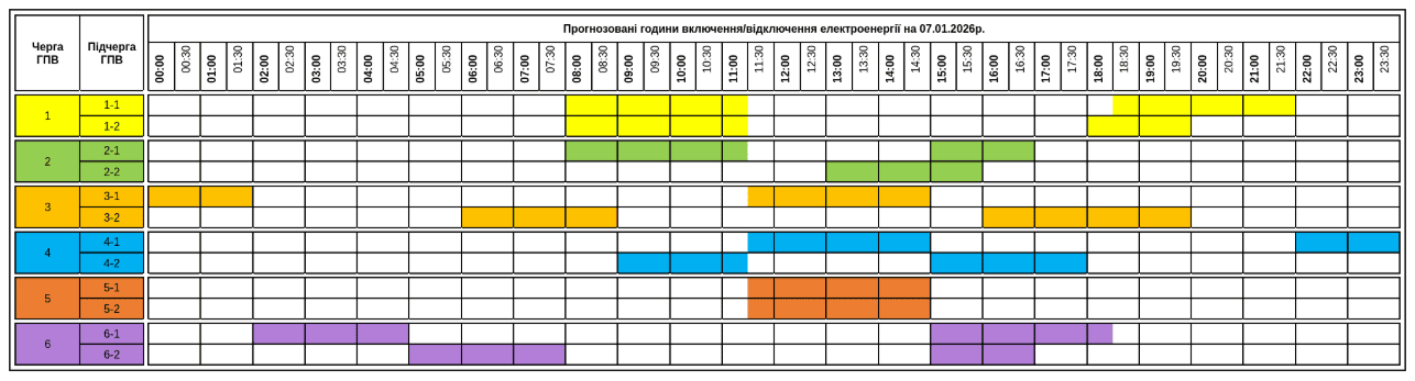 В усіх регіонах України у середу, 7 січня, буде запроваджено графіки погодинних відключень світла. Причина обмежень електропостачання — наслідки російських масованих ракетно-дронових атак на енергооб’єкти.