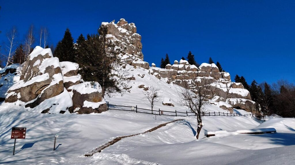 Природа біля Тустані взимку / фото Марина ГригоренкоОтже, історики зауважують, що місто-фортеця Тустань існувало тут з 9 по 16 століття нашої ери. Це був стратегічний пункт карпатської оборони і одночасно митниця. Загалом за цей час тут було п’ять варіантів дерев’яної фортеці, побудованої прямо на скелях, однак зараз від неї нічого не лишилася. Тож подивитися, як вона мала виглядати, можна лише за допомогою доповненої реальності у спеціальному додатку в телефоні (скачати можна за допомогою QR-кодів, розміщених на території заповідника).