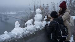 Підпис до фото, Жінка та дитина ліплять сніговика на оглядовому майданчику в парку Хрещатик