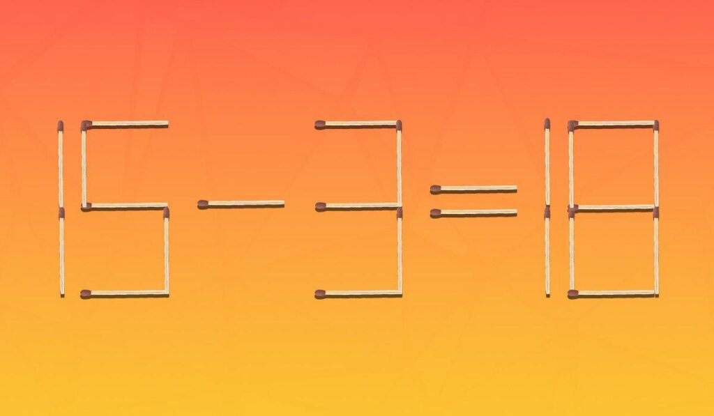 Перед вами неправильна математична рівність 15 – 3 = 18, складена із 24 сірників. Завдання полягає в тому, щоб, пересунувши лише один сірник, змінити приклад так, аби він став логічно правильним. Для цього потрібно зосередитися та подивитися на цифри під іншим кутом.