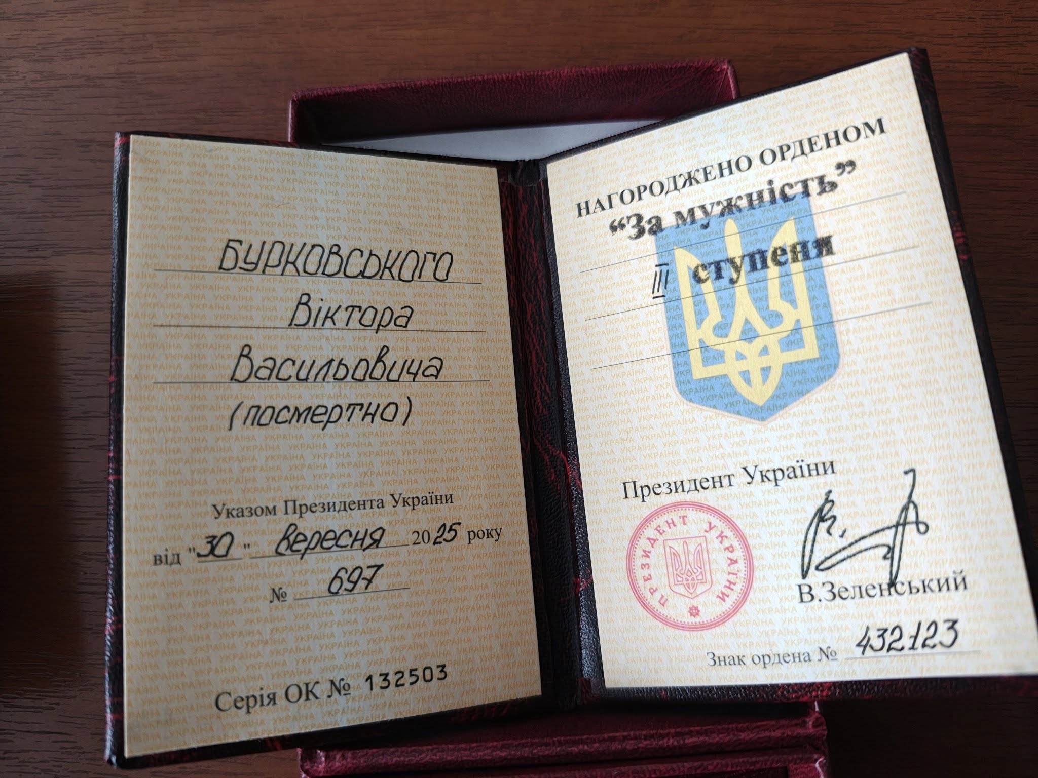 За особисту мужність, виявлену в захисті державного суверенітету та територіальної цілісності України, самовіддане виконання військового обов’язку, відповідно до указу президента України, орденом «За мужність» ІІІ ступеня посмертно нагородили солдата Віктора Васильовича Бурковського з Пожарок. Нагороду сина отримав батько Василь Михайлович Бурковський.