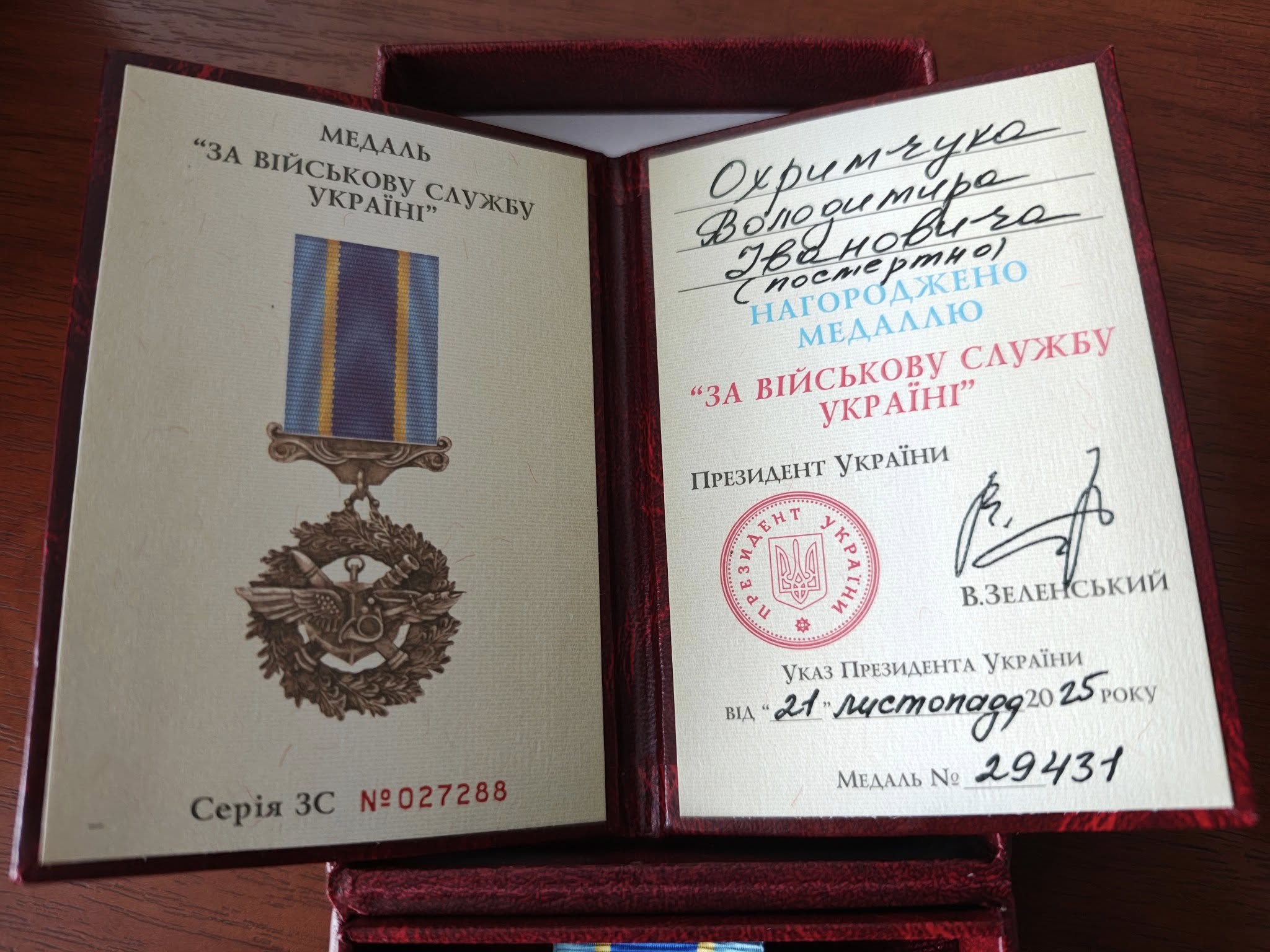 Медаль «За військову службу Україні», якої посмертно удостоєно загиблого захисника з Рожища, механіка-водія розвідувального взводу механізованого батальйону 47-ї окремої механізованої бригади «Ма́ґура» Володимира Івановича Охримчука, отримали дружина та син Героя.