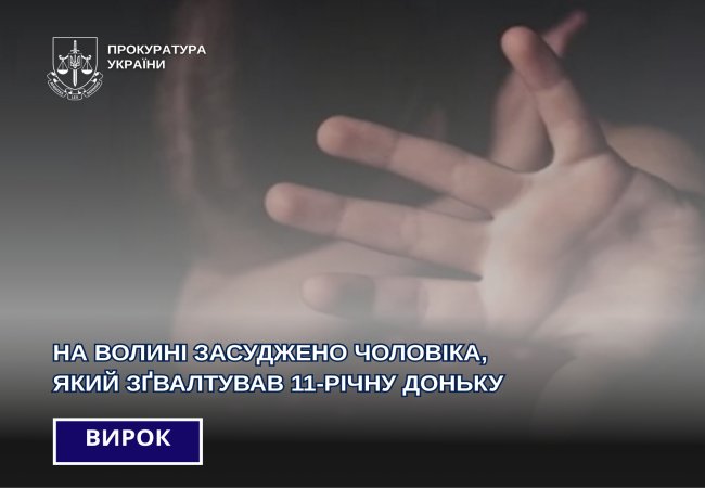На Волині набрав законної сили вирок 52-річному чоловікові, визнаному винуватим у зґвалтуванні, неодноразовому сексуальному насильстві щодо 11-річної доньки та заподіянні їй тілесного ушкодження середнього ступеня тяжкості (ч. 4 с. 152, ч. 6 ст. 153, ч. 1 ст. 122 КК України).