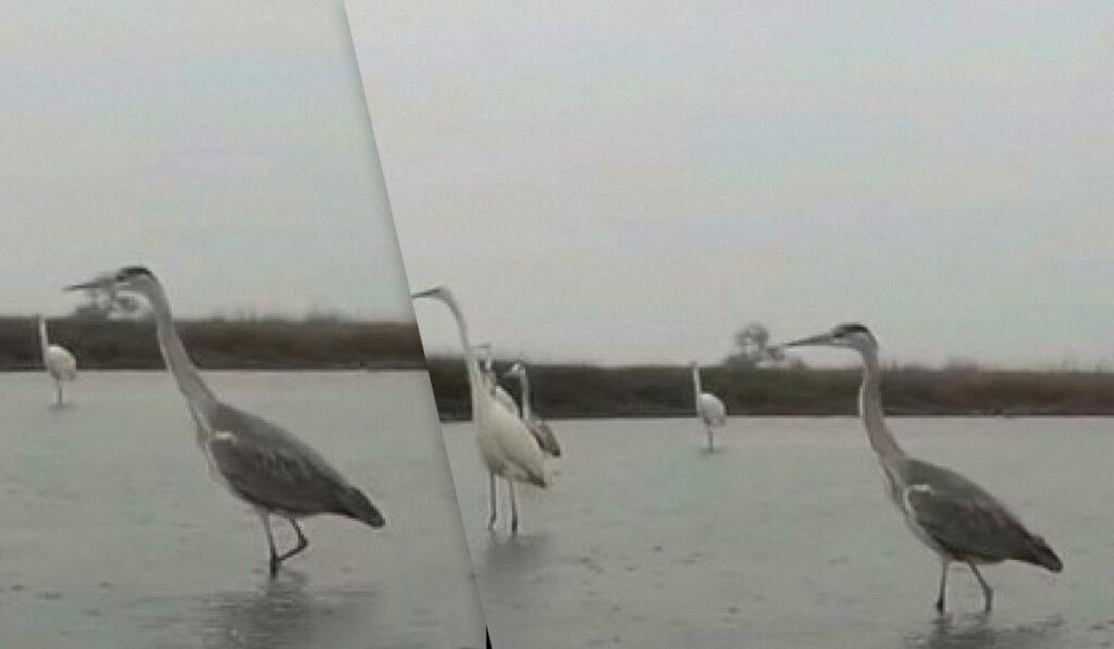 Про це розповів доктор біологічних наук, співробітник нацпарку Іван Русєв. Він оприлюднив у відео, ймовірно, з фотопастки, на якому можна побачити величних птахів на мілководді. Попри негоду, вони шукають їжу.