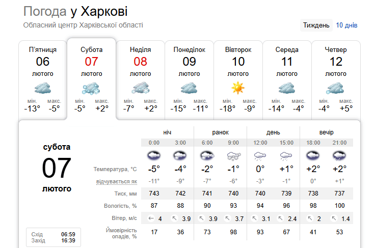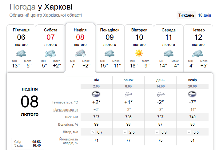 У вівторок, 10 лютого, очікується пік похолодання. Попри мінливу хмарність без опадів, вночі вдарять справжні люті морози — від -17 до -22 градусів морозу вночі. Вдень стовпчики термометрів показуватимуть від -7 до -12 градусів морозу.