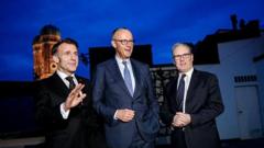 Підпис до фото, Еммануель Макрон, Фрідріх Мерц і Кір Стармер на Мюнхенській безпековій конференції, лютий 2026
