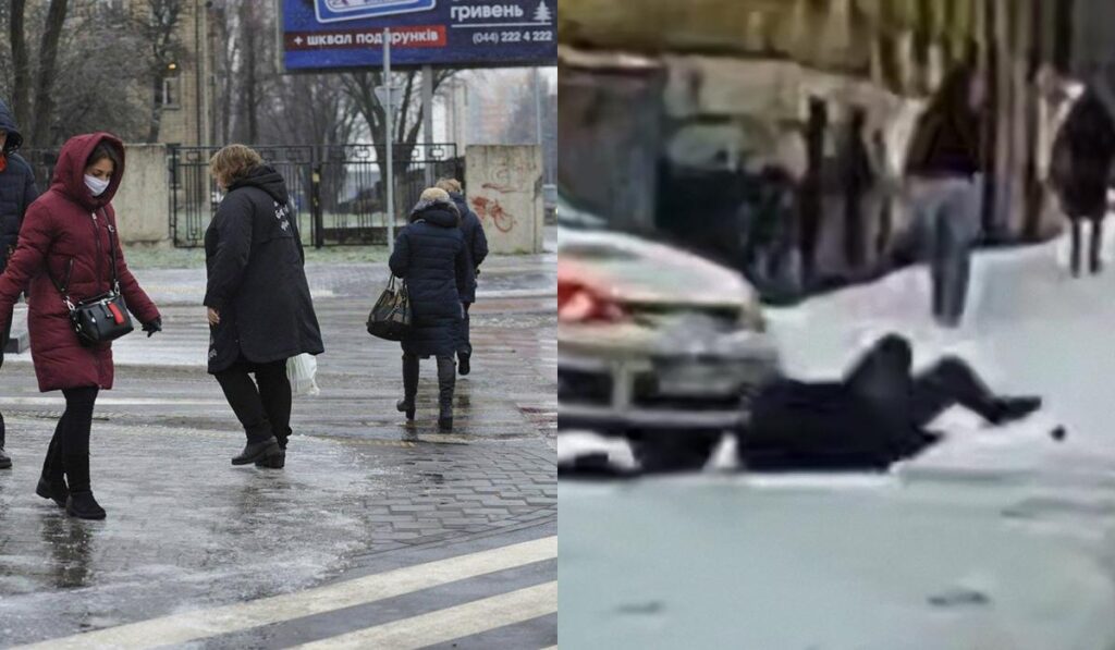 На кадрах видно, як чоловік впевнено переходить дорогу, аж раптом він послизнувся й впав. В цей момент поряд проїжджав автомобіль й не встиг загальмувати, зачепивши пішохода.