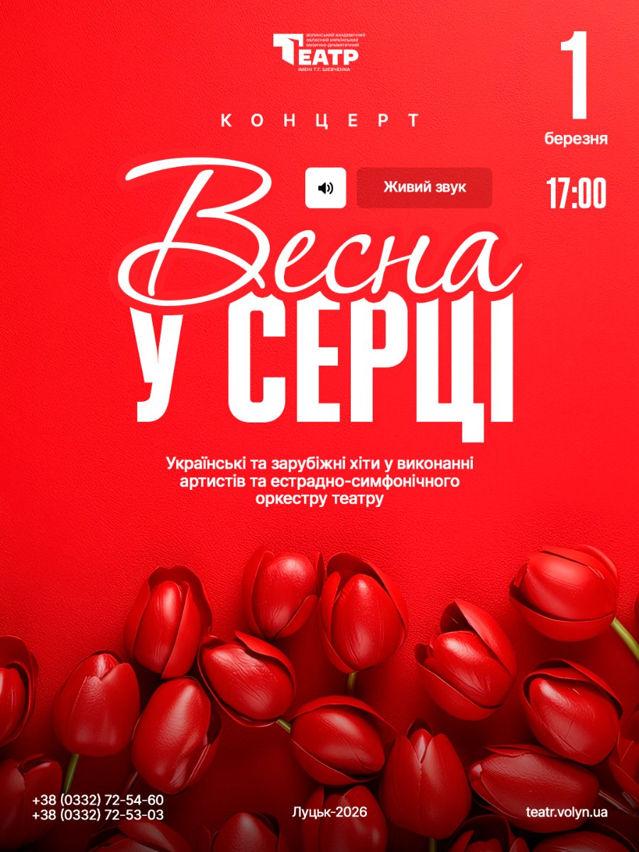 У неділю, 1 березня, о 17:00 – концерт на два відділення «Весна у серці» у виконанні артистів та естрадно-симфонічного оркестру театру. Основна сцена. Тривалість – 2 години 15 хвилин (антракт – 15-20 хв).