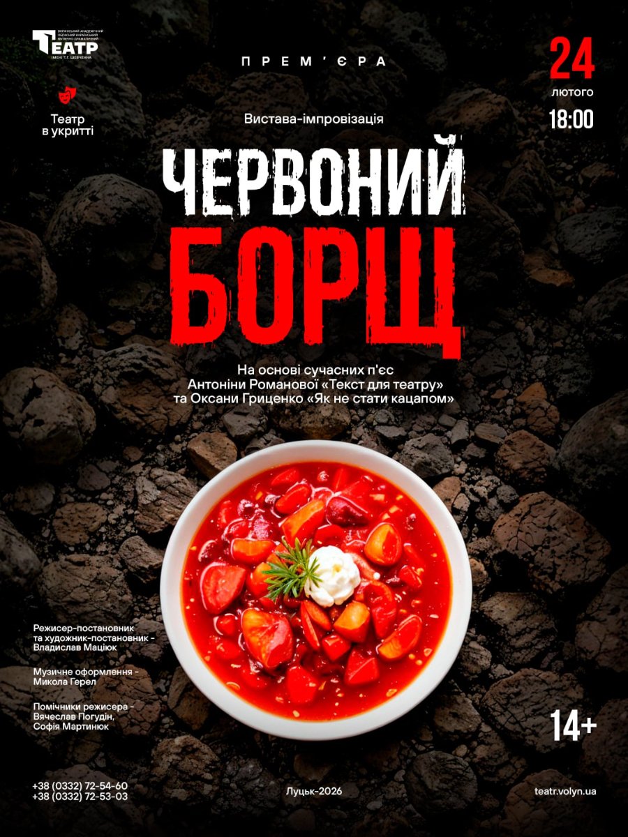 У вівторок, 24 лютого, о 18:00 – вистава-імпровізація «Червоний борщ» на основі сучасних п’єс Антоніни Романової «Текст для театру» та Оксани Гриценко «Як не стати кацапом». Режисер-постановник – Владислав Маціюк. Тривалість – 1 година (без антракту).