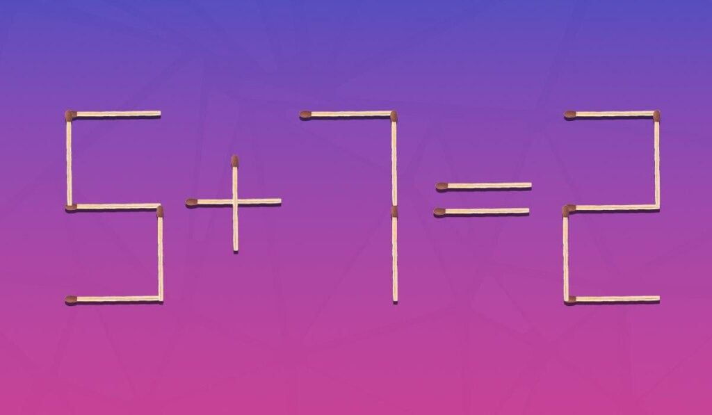 Нижче ви побачите зображення, де за допомогою сірників викладено рівняння 5+7=2. Очевидно, що тут є помилка, адже відповідь мала би дорівнювати 12.