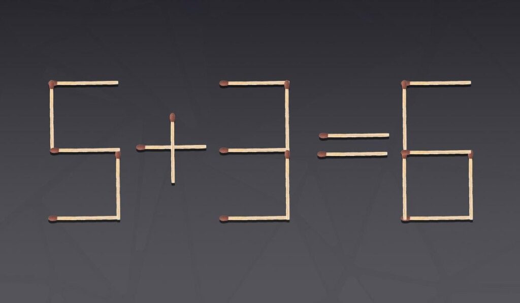 Нижче ви побачите зображення, на якому за допомогою сірників викладено рівняння 5+3=6. Очевидно, що воно не є правильним, адже за всіма правилами арифметики, відповідь мала би дорівнювати 8.