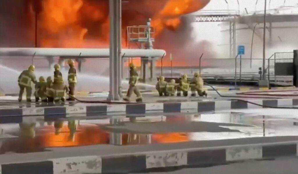 На місці іранської атаки спалахнула велика пожежа. Кадри гасіння вогню рятувальниками показали на сторінці Генерального штабу армії Кувейту в соцмережі Х.