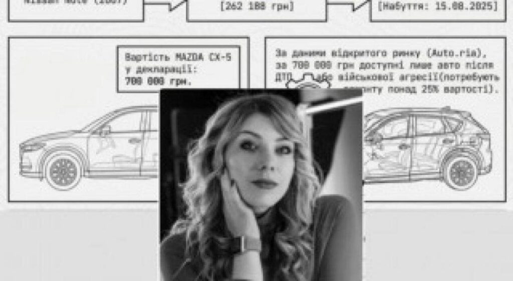 “У 2024 році Бурмистрова задекларувала квартиру площею 38,4 кв. м у селі Крюківщина Київської області. Вартість житла – 2 083 000 грн. Фактично після переїзду до столиці в неї з’явилася нерухомість під Києвом – актив, який складно назвати рядовою покупкою для державного службовця із зарплатою правоохоронця. При цьому це не єдине її майно. У декларації також зазначена квартира в Запоріжжі площею 40,18 кв. м, якою вона володіє спільно з матір’ю, а також земельна ділянка в Запорізькій області у спільній власності з батьком. Покращення матеріального становища можна простежити і за автомобілями. Якщо раніше Бурмистрова декларувала Nissan Note 2007 року та Mazda 3 2014 року, то у 2025 році в декларації з’явилася Mazda CX-5 2024 року випуску. Її задекларована вартість – 700 000 грн. Ця цифра виглядає щонайменше дивно, адже, за даними відкритого ринку, Mazda CX-5 2024 року за таку суму зазвичай може бути автомобілем після ДТП або з істотними пошкодженнями”, – йдеться у розслідуванні.